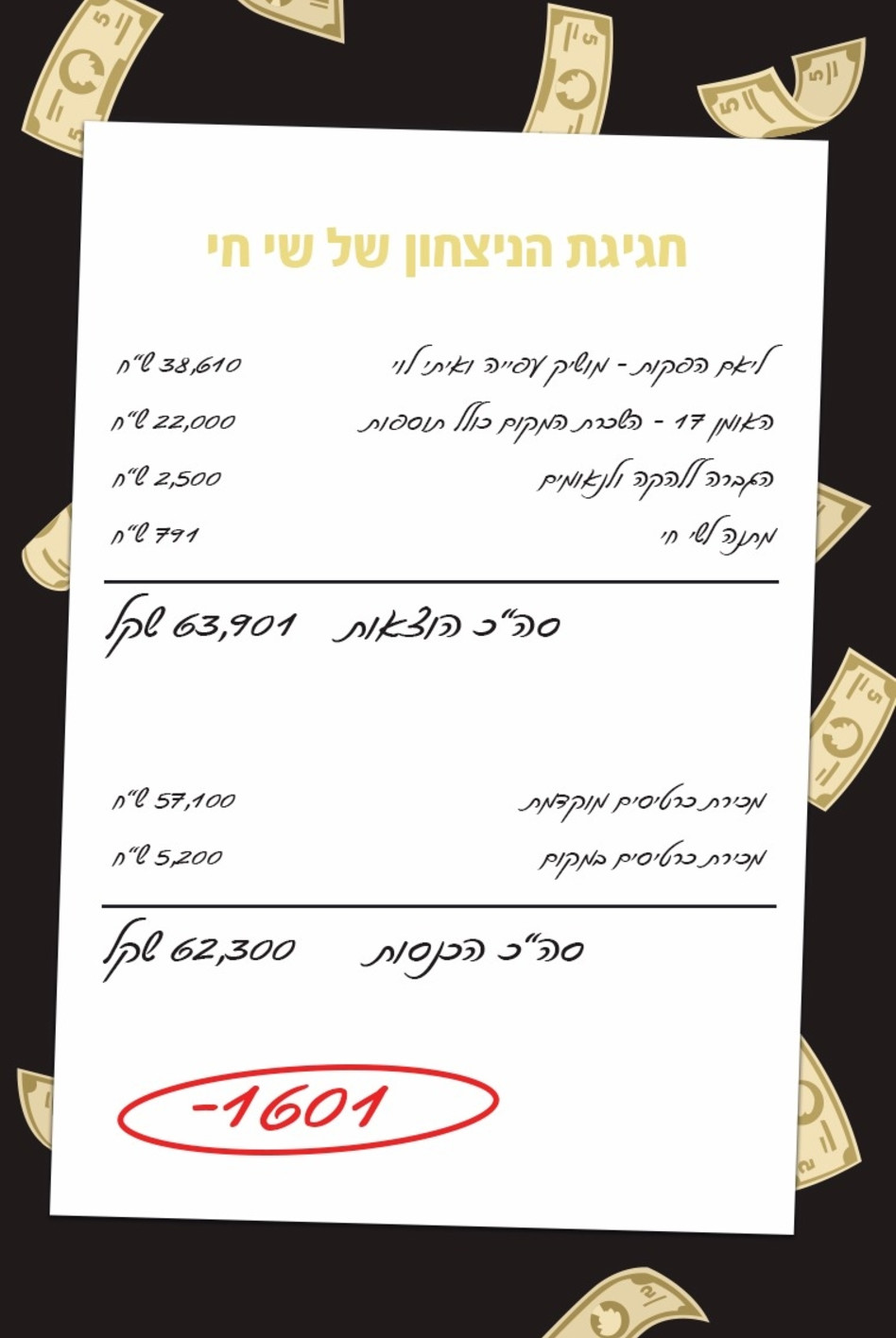 "לצערנו לא היו לנו מספיק הכנסות מהערב בשביל לתרום. נהפוך הוא, הגענו למצב שאנחנו צריכים להשלים את ההוצאות מכיסנו הפרטי", הסביר אחד ממארגני האירוע. אז ככה, הופעותיהם של מנצח "האח גדול VIP" מושיק עפיה והזמיר איתי לוי, עלו כ-38,610 שקלים. השכרת מועדון "האומן 17", כולל אבטחה מתוגברת, מקרן לסרטים וקופת כרטיסים עלו כ-22 אלף ש"ח. על הגברה שילמו 2,500 שקלים, בעוד שהמתנות ה"צנועות" לשי חי עלו כמעט 800 ש"ח. בסך הכל? 63,901 שקלים חדשים.