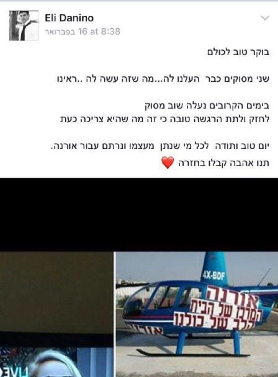 בפוסט מרגש שפרסם הוא משתף שהוא, הילדים, ובני המשפחה גאים באורנה ושהיא מדהימה, למרות כל ההשמצות והקללות. ואיך זה בא לידי ביטוי? הוא לאחרונה שלח לה שני מסוקים שיחוגו מעל שמי נווה אילן לחיזוקה. עד פה הכל כשורה, אך לצד זאת הוא גם נלחם ונאבק בכל מי שמעז לדבר סרה על גרושתו ואם ילדיו, ואף מרחיק לכת, מקלל ומאחל למותם של השונאים.