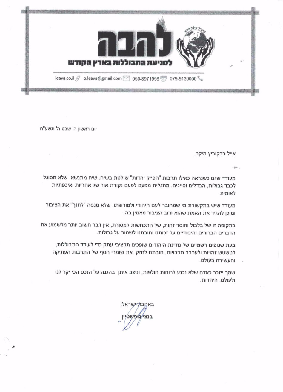 קבלו הצצה בלעדית: "מעודד שיש בתקשורת מי שמחובר לעם היהודי ומורשתו. שלא מנסה ל'חנך' את הציבור ומוכן להגיד את האמת שהוא ורוב הציבור מאמינים בה. בעת שגופים רשמיים של מדינת היהודים שופכים תקציבי ענק כדי לעודד התבוללות, חובתנו לחזק את שומרי הסף של התרבות העתיקה והעשירה ביותר בעולם. שמך ייזכר. כאדם שלא נכנע לרוחות חולפות וניצב איתן בהגנה על הנכס הכי יקר לנו לעולם, היהדות".