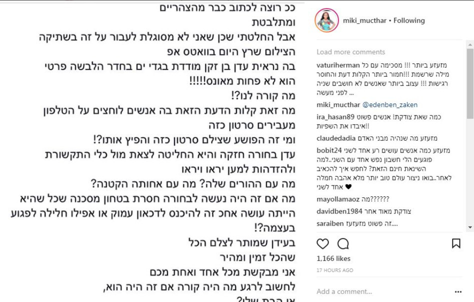 מקורבים לבן זקן מספרים שעל הזמרת עברה יממה מאד לא פשוטה ולא קלה. לא רק על הזמרת גם על בני משפחתה ובעיקר על ארוסה שוקי ביטון שנאלץ לחלוק עם זרים את אשתו לעתיד. מקורביה של בן זקן ביקשו להניח לה בימים אלה לנפשה עד שתעבור הסערה והמבוכה שפקדה אותה ואת בני משפחתה.