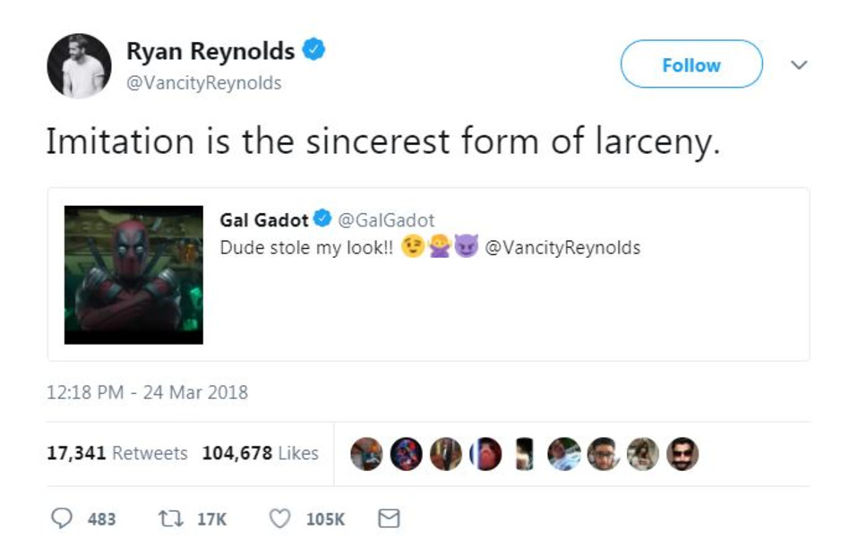 הכוכבת הישראלית המצליחה בעולם גל גדות ששוהה בימים אלו בארצנו הקטנטונת, החליטה לעקוץ בהומור את הקולגה שלה לתעשיית סרטי גיבורי העל ריאן ריינולדס בפומבי, בחשבון האינסטגרם שלה. גדות הוונדרוומן ההוליוודית שיתפה תמונה של ריינלודס מקידום הסרט "דדפול" בה הוא נראה עומד עם דמותו כשידיו מוצלבות על החזה וטענה כי הוא מנסה לגנוב לה הלוק.