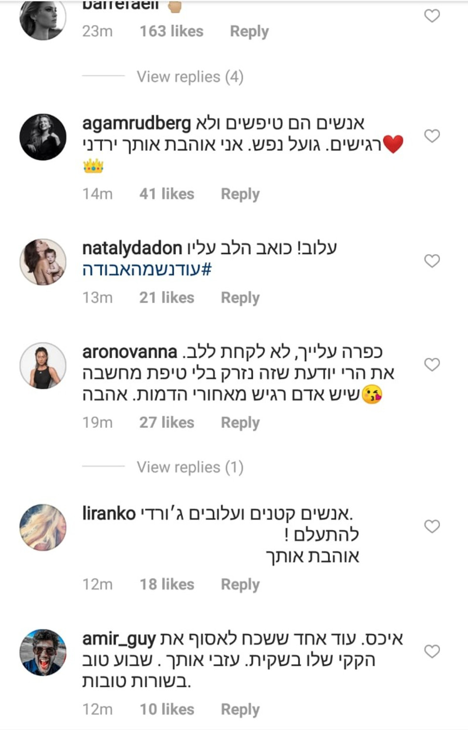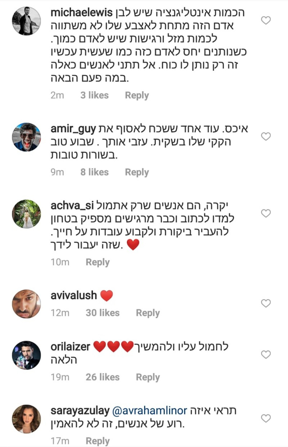 תוך שניות חבריה לתעשיה שרבים מהם לקחו חלק בקמפיינים שונים נגד "בריונות רשת" החלו בתגובות תומכות והביעו את אהבתם. אגם רודברג כתבה " אנשים הם טיפים ולא רגישים. גועל נפש", השחקן ישראל אטיאס "שאף אחד לא יחדיר לך חושך לאור שאת", נטלי דדון כתבה "עלוב! כואב עליו הלב" ועוד רבים ואחרים.