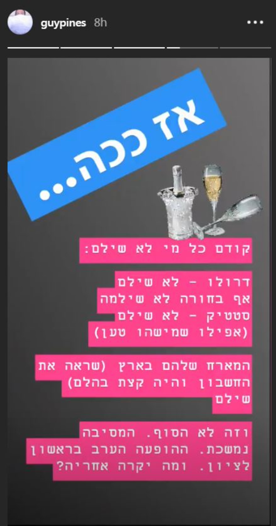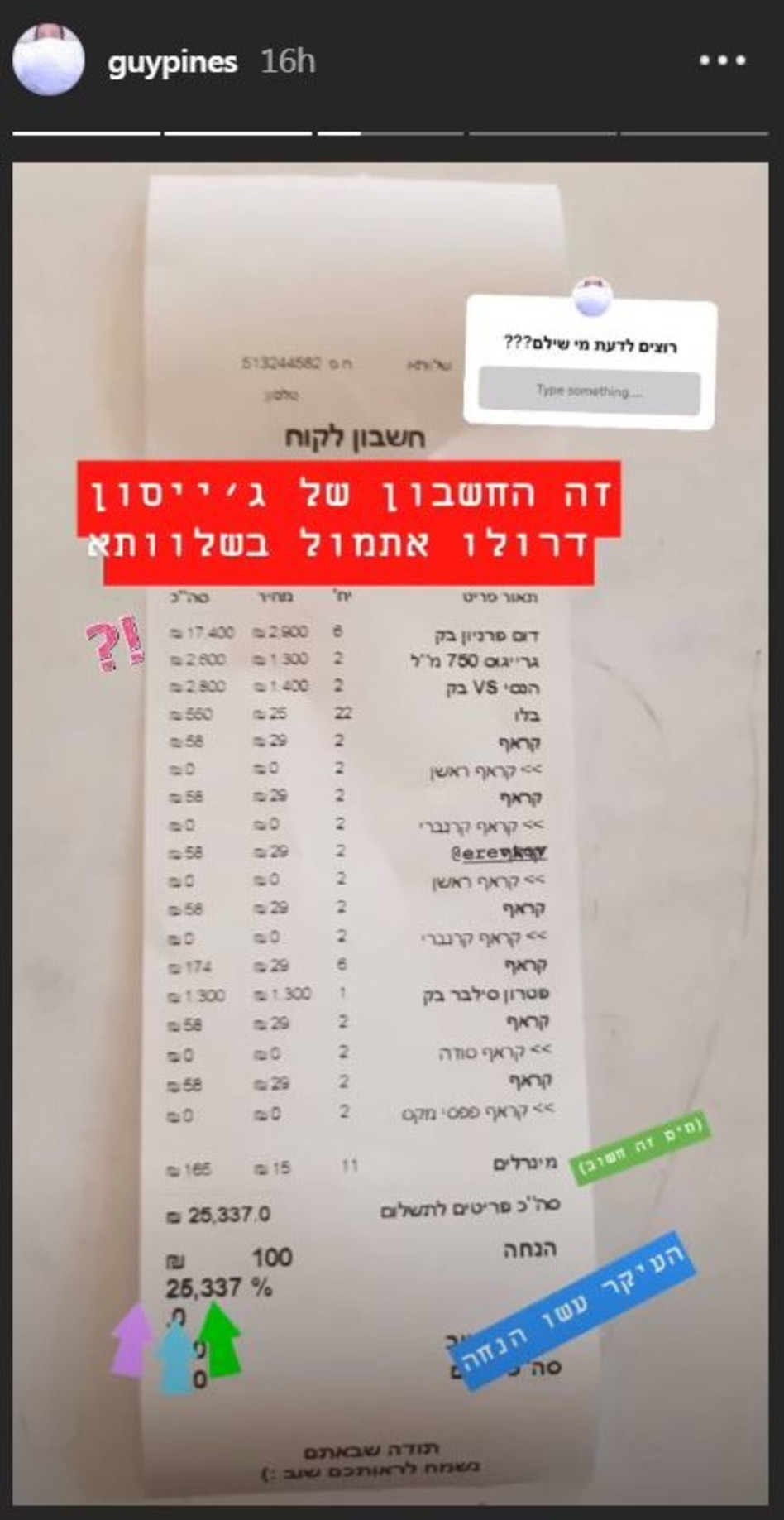 בתחילת השבוע בילה סטטיק במועדון תל אביבי יחד עם הכוכב והמוזיקאי ג'ייסון דרולו שמבקר בארץ לקראת ההופעה שלו ב" "wow פסטיבל אך מה שהתחיל כבילוי "רגיל" עבורם הפך לנושא לשיחה עבור אחרים. בוקר לאחר מכן היציאה סטטיק הופתע לראות כי המגיש גיא פינס העלה בחשבון האינסטגרם הפרטי שלו צילום של החשבון המציג את מה שהזמינו השניים, משקאות ומטעמים שעמדו על סך של 25 אלף שקלים. פינס רמז לכל עוקביו כי לא דרולו וסטטיק שילמו על כל מה שנצרך אלא המארח ה"המום" שלהם.