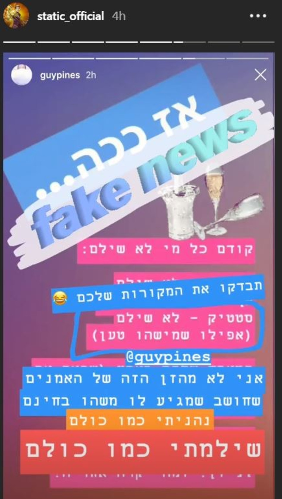 סטטיק מיהר להשיב לגיא פינס תגובה, הכריז בסטורי שלו באינסטגרם "פייק ניוז" והוסיף "אני לא מהזן הזה של האמנים שחושב שמגיע לו משהו בחינם. נהנתי כמו כולם, שילמתי כמו כולם". הזמר שכנראה לא חשב שהכל בסדר טודו בום אף פירסם סרטון שלו בו הוא פנה לפינס ואמר: "מה שיותר מעפן מזה שגיא פינס לא בדקו לפני שהם פרסמו את השטויות האלה זה שיש אנשים שחושבים שזה באמת עובד ככה אז זה לא, זה לא עובד ככה. אני יוצא להינות אני משלם כמו כולם. פיס"