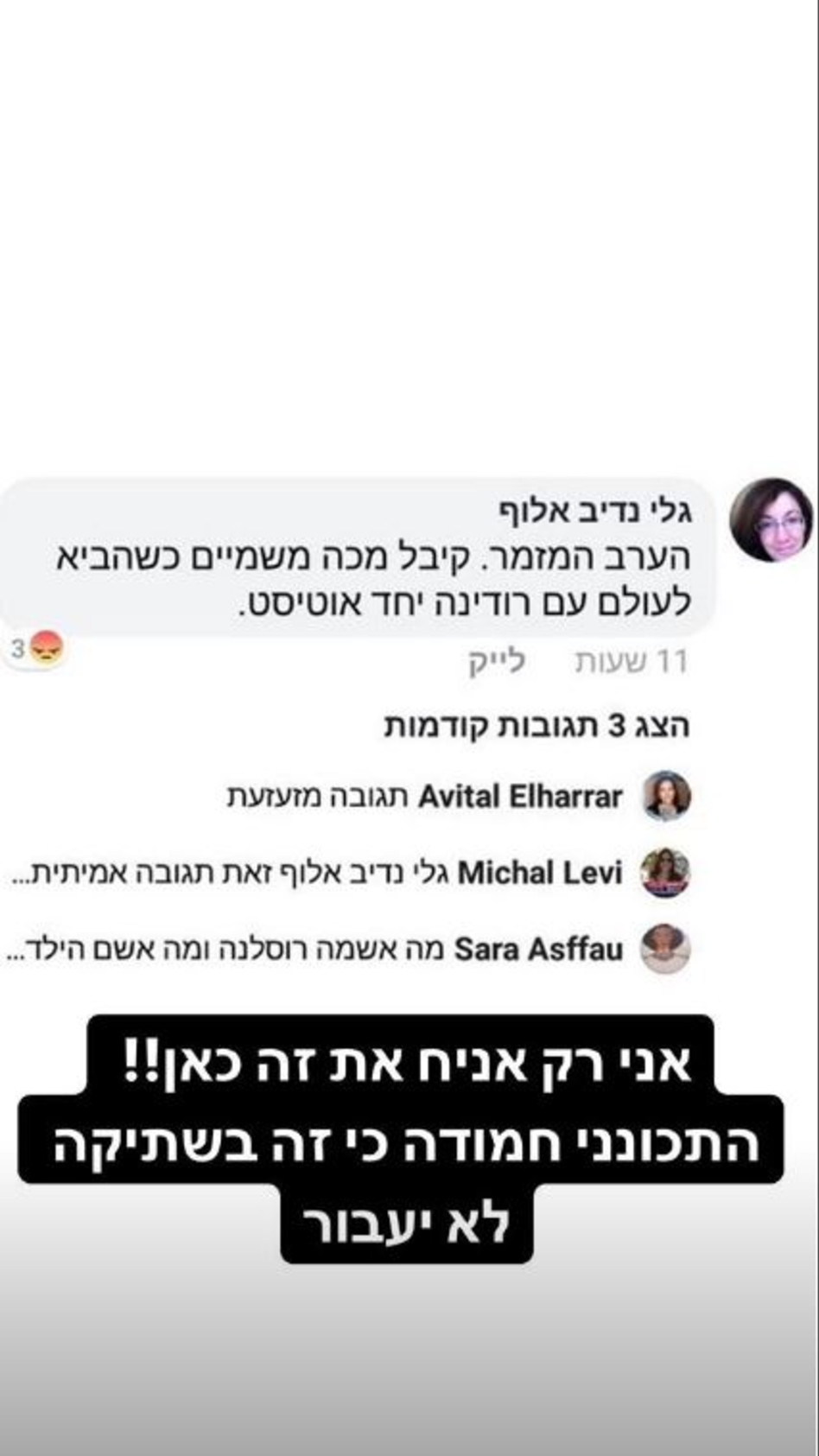 רודינה בחרה לשתף ברשתות החברתיות תצלום מסך של פרופיל פייסבוק של אישה העונה לשם גלי נדיב אלוף ומציגה עצמה כמדיום במקצועה. אותה אישה כתבה תגובה מרושעת על בנם המשותף של רודינה ואייל גולן בפוסט שעלה נגד הזמר אודות הסערה סביב אות ההוקרה שקיבל בכנסת ישראל. וכך כתבה "הערבי המזמר. קיבל מכה משמיים כשהביא לעולם עם רודינה יחד אוטיסט".