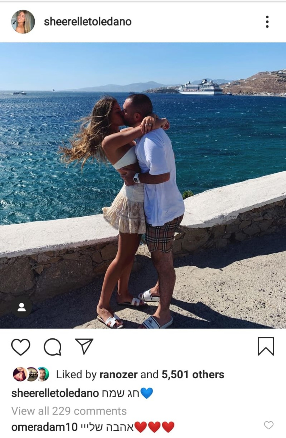 אחרי שנתפסו בתמונות פפראצי, בשעות אחר הצהריים העלתה טולדנו לחשבון האינסטגרם שלה תמונה לכבוד החג של הזוג החדש כשהם לבושים בלבן על יד הים, מחובקים ומתנשקים כשהיא מאחלת לעוקביה "חג שמח". עכשיו זה כבר בטוח, טולדנו ואדם הם זוג לכל דבר ואם זה לא הספיק לכם אדם אפילו הגיב לבחירת ליבו אל מול כולם "אהבה שלי" בצירוף אימוג'י של לבבות.