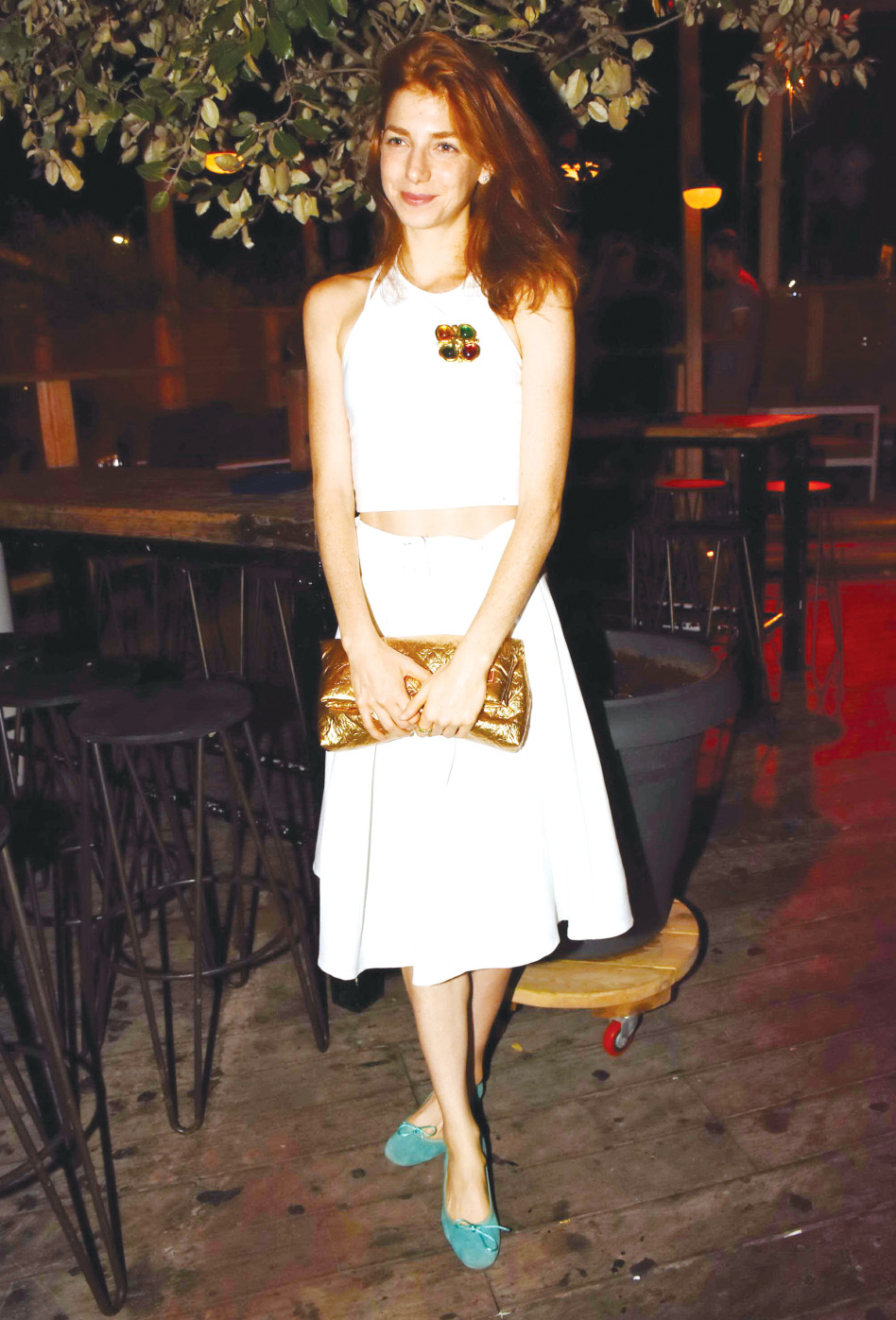 מאיה ורטהיימר לא חוששת להתאים גופייה לבנבנה סמי-שקופה חושפת בטן, לחצאית קצרצרה. הטוויסט: אקססוריז בהם סיכת דש בעלת נוכחות, תיק קלאץ' ונעליים, כולם בגווני טורקיז וזהב, שתואמים לשיערה האדמוני.