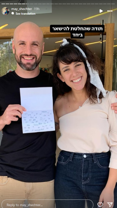 "הרגע הזה שחתמנו על חוזה על רייצ'וק, יום נישואים שמח חיים שלי, 5.10.21", כך התחילה שכטר את הברכה המרגשת. "היום אנחנו 3 שנים ביחד, עם כל האהב ולמרות כל הקשיים שהחיים הציבו בפנינו. אני גאה בנו. זה לא פשוט. לצאת מאזורי נוחות, לצמוח ולגדול זה ממש קשה ואני פשוט גאה בנו, תודה על אהבה אינסופית. תודה שאתה לא מוותר עליי בתקופות שויתרתי על עצמי ממזמן" המשיכה.