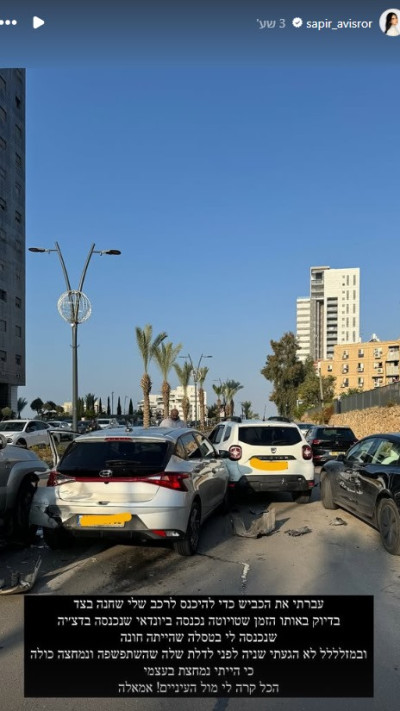 עוד כתבה והוסיפה: "במזל לא הגעתי שניה לפני לדלת שהשתפשפה ונמחצה כולה, כי הייתי נמחצת בעצמי, הכל קרה לי מול העיניים, אמאלה". לבסוף היא הציגה את דלת הרכב שלה שניזוקה לצד הכיתוב, "הכביש כל כך מסוכן".