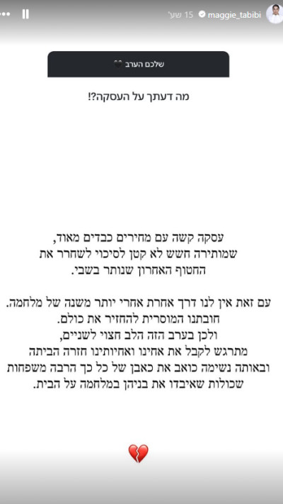 מגישת מהדורת חדשות 14 המרכזית, מגי טביבי, ניצלה את צאת השבת ותחילתו של השבוע החדש, שמביא עימו את הציפייה לשובם של החטופים במסגרת העסקה שנסגרה, כדי לענות על שאלות גולשים. אחת השאלות ששאלו אותה הייתה: "מתי תראייני את נתניהו?" ראש הממשלה, כמו ידוע, התראיין בעבר מספר פעמים אצל קולגות של טביבי בערוץ, ביניהם ינון מגל ויעקוב ברדוגו.