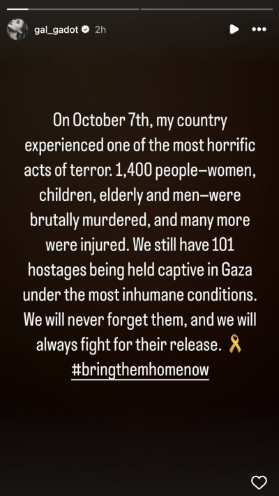 אך כזכור ב-7 באוקטובר השחקנית ההוליוודית שברה את שתיקתה ברגע שפרסמה ליותר מ-108 מיליון העוקבים שלה ברחבי העולם: "בשביעי באוקטובר המדינה שלי חוותה את אחד מאירועי הטרור האיומים. 1,400 אנשים - נשים, ילדים, מבוגרים וגברים נרצחו באכזריות - רבים נוספים נפצעו״.